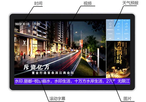 視頻、圖片、文本(滾動字幕)等多媒體文件上傳至服務(wù)器,制定各種多媒體組合播放內(nèi)容, 下發(fā)給各顯示終端,可設(shè)定循環(huán)、定時(shí)、定次、插播、墊片、流媒體直播等播放方式。