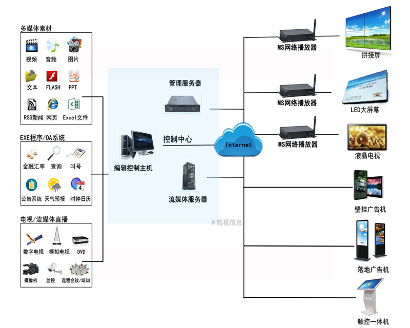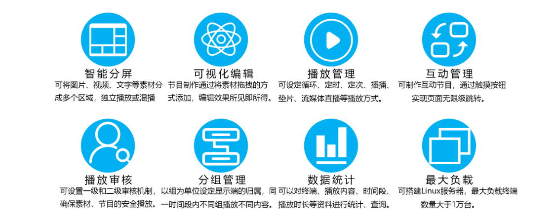 可搭建Linux服務(wù)器;最大負(fù)載終端數(shù)量大于1萬臺;支持多點(diǎn)同步播放;支持電視信號輸入。